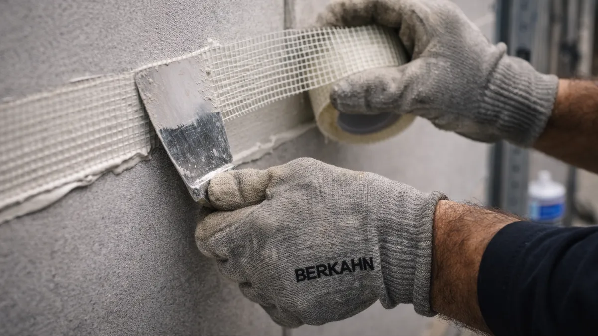 Para o gesso acartonado interno, o sistema de três demãos de massa com fita microperfurada de papel é o padrão. Um dado que poucos no Brasil conhecem: pesquisas do USG Research Center nos Estados Unidos demonstraram que juntas tratadas com tela de fibra de vidro (mesh tape) são mais propensas a fissurar do que juntas com fita de papel, porque a fibra cede sob tensão mesmo depois de coberta com massa. A recomendação internacional consolidada é fita de papel para todas as juntas regulares, reservando a tela de fibra para reparos e áreas úmidas onde deve ser combinada com massa de secagem rápida (setting-type compound).